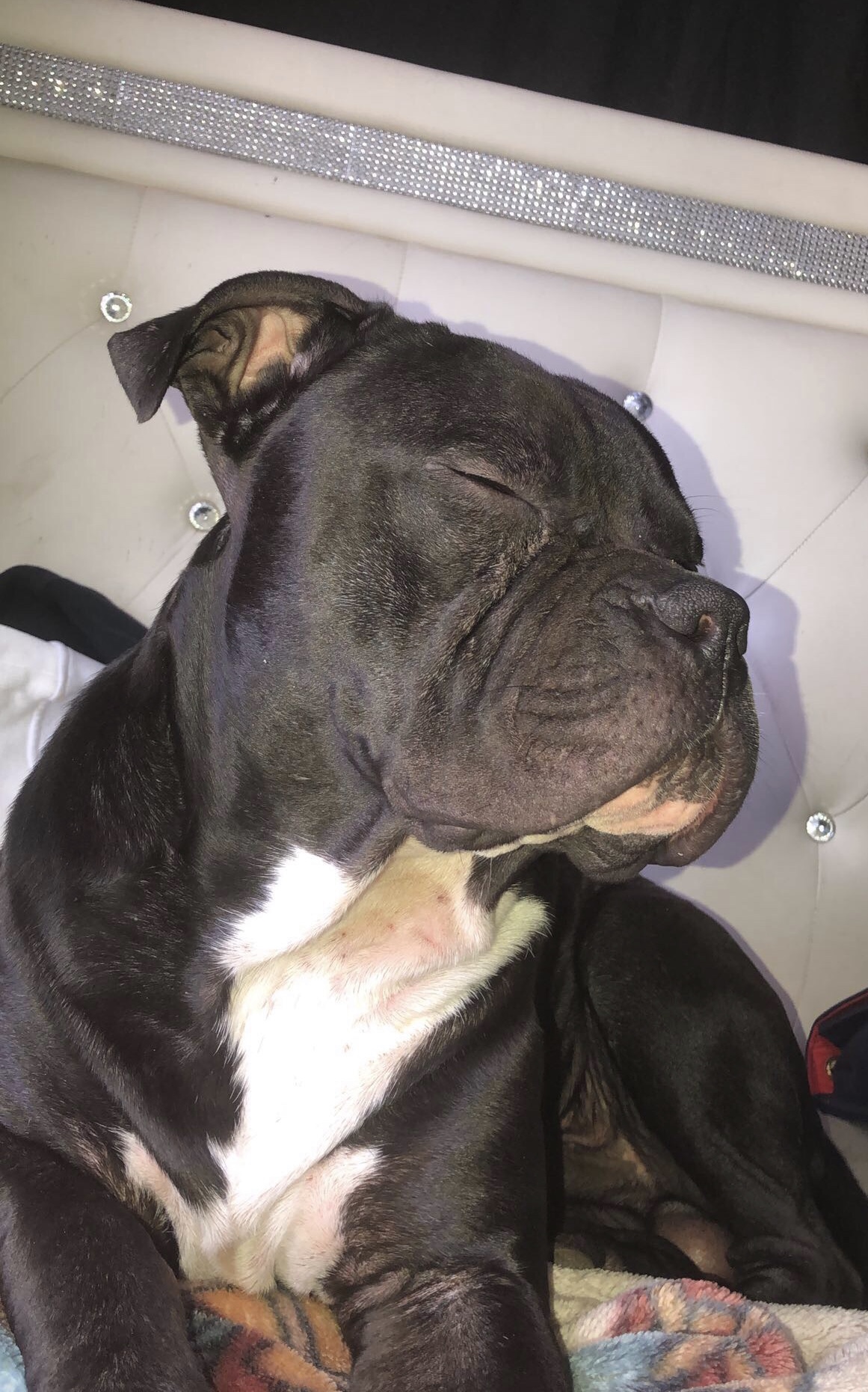 Pet Description:He’s black with white on his chest pit bull mix. He has a scar on his right back leg and on his back left leg he has a single white toe nail and the end of his tail bends a little. |