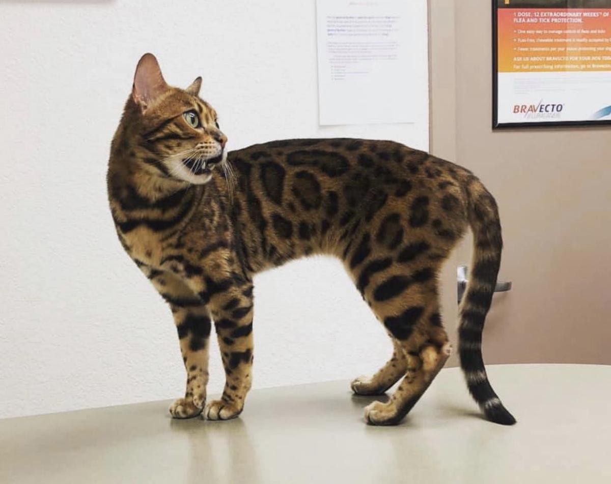 Pet Description:Jimmy is a 4 year old male Bengal Cat. He is neutered. He has green eyes, a silky leopard coat, skinny build, and is very vocal. He does not wear a collar, but is microchipped. |
