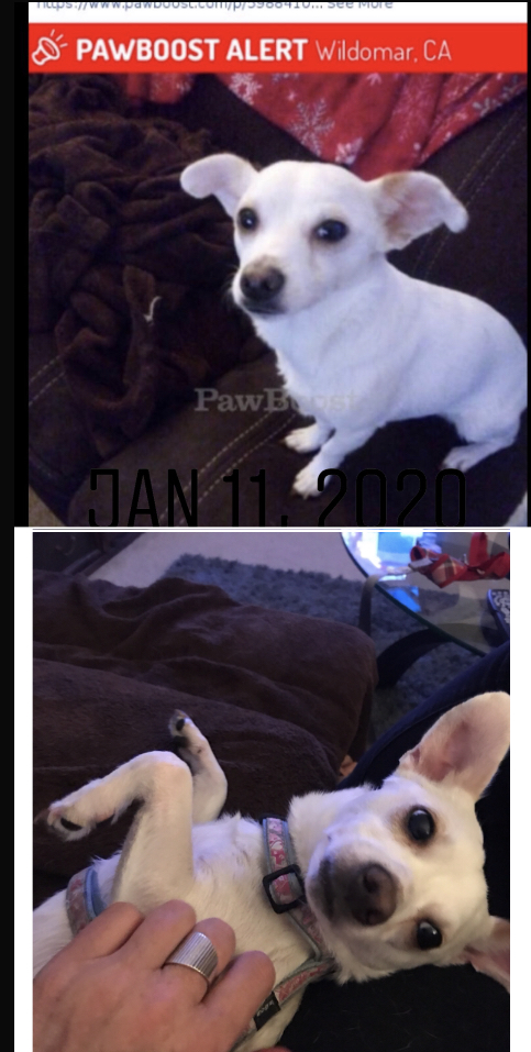 Pet Description:White smooth coat Chihuahua with tan spots on lower back and left ear - he’s very sweet but shy & defensive- DO NOT CHASE - he loves treats - and if you stay still , he might come to you -thank you for all your help! |