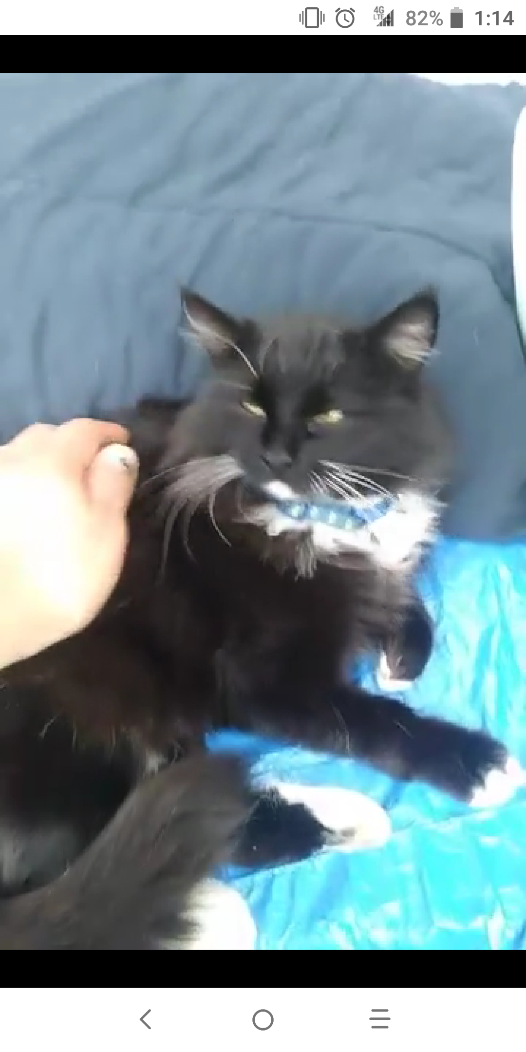 Pet Description:Black some white in her chest and paws.She is wearg blue collar with heart tag with info. |