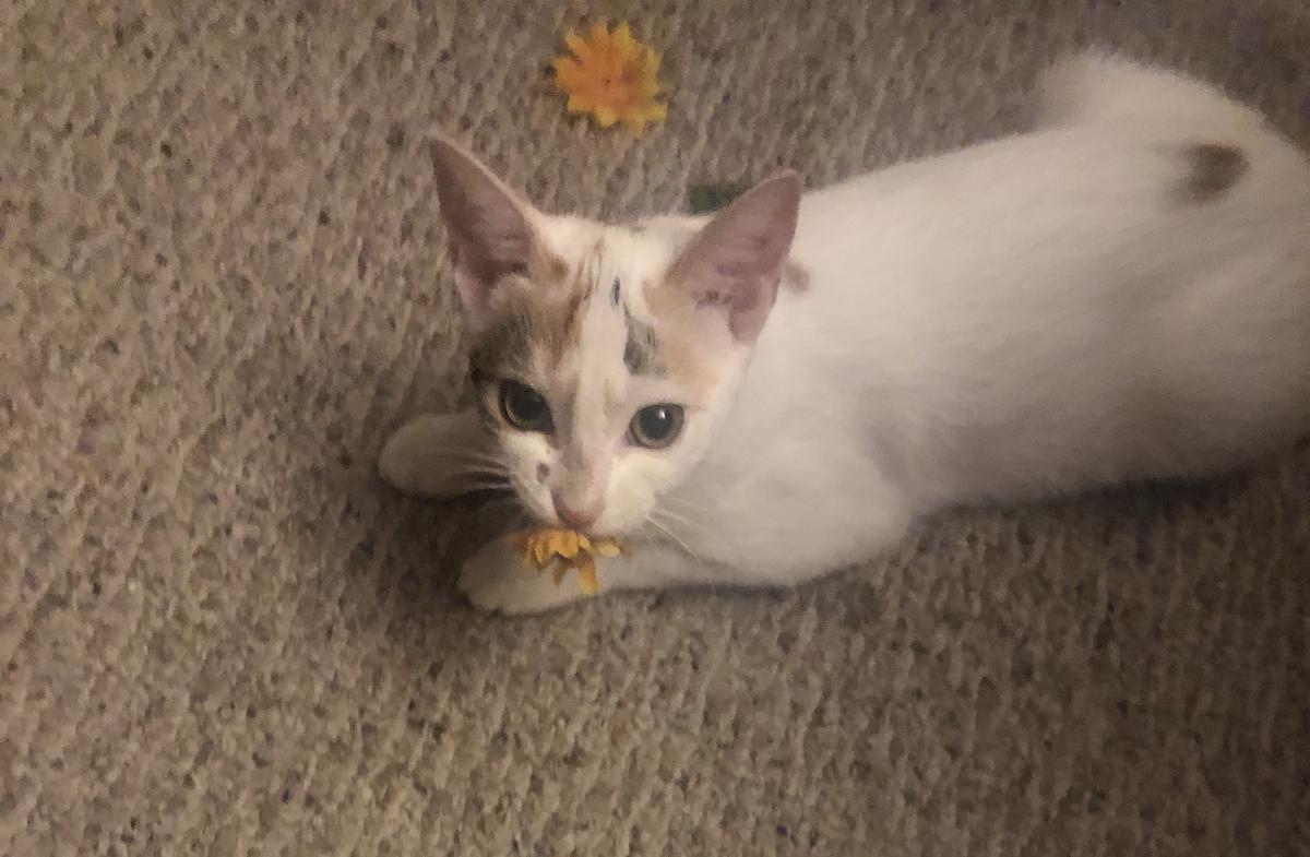 Pet Description:All white with a grey tabby pattern patch on eye also orange on her leg she has a “birth mark” looking orange color on ear |