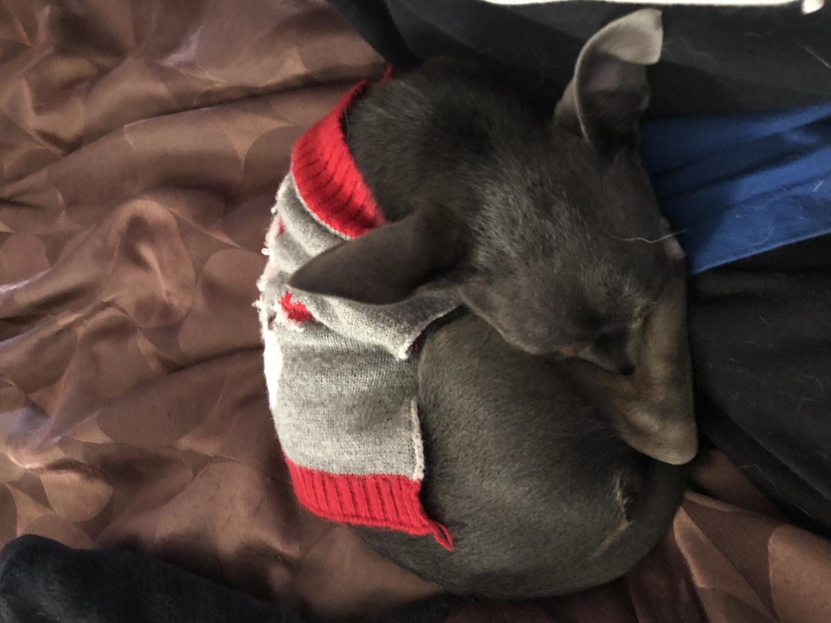 Pet Description:Grey and white small chihuahua pink and black zebra stripe collar only 10 months old |