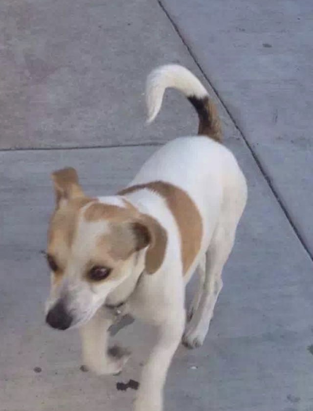 Pet Description:She is not wearing a collar, her tail is half white and half brownish black, her body is mostly white with a brow spot. |