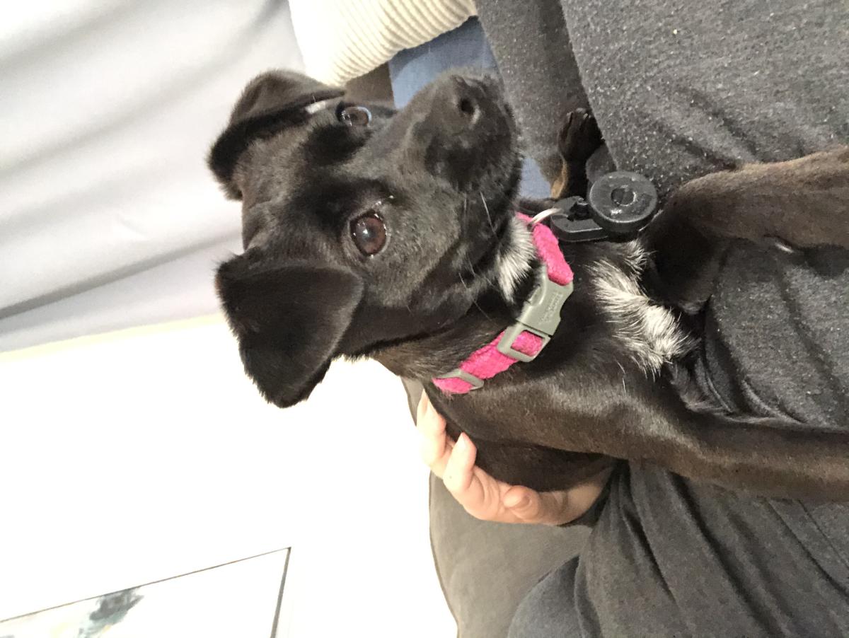 Pet Description:Small black Mixed breed. She has a smooth coat with a white spot in the front and looks like a tiny black Labrador. She is very friendly. |