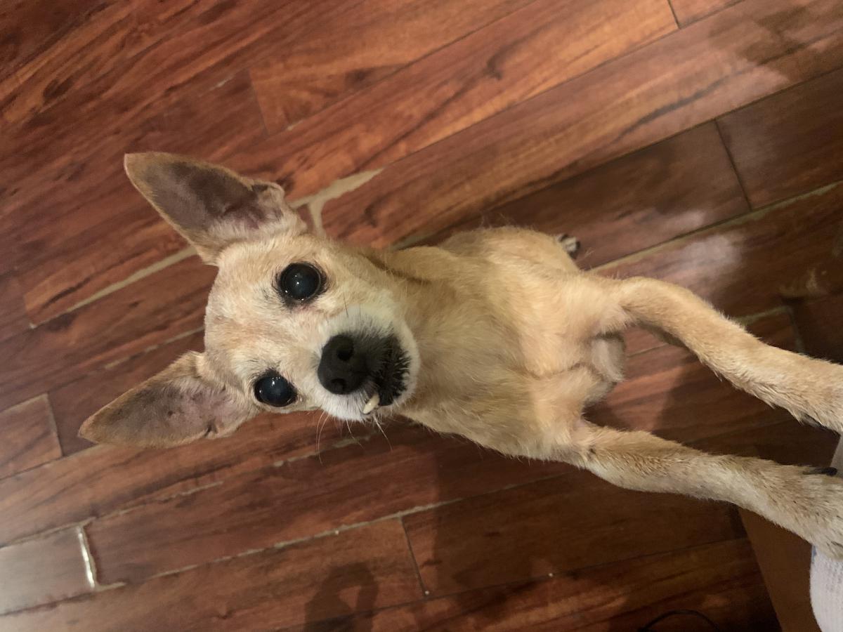 Pet Description:Small dog, brown, black eyes, one tooth poking out, |