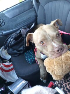 Pet Description:She a tan and white red nose pit one of her ears has a cut in her ear and the tip of her ear is bent |