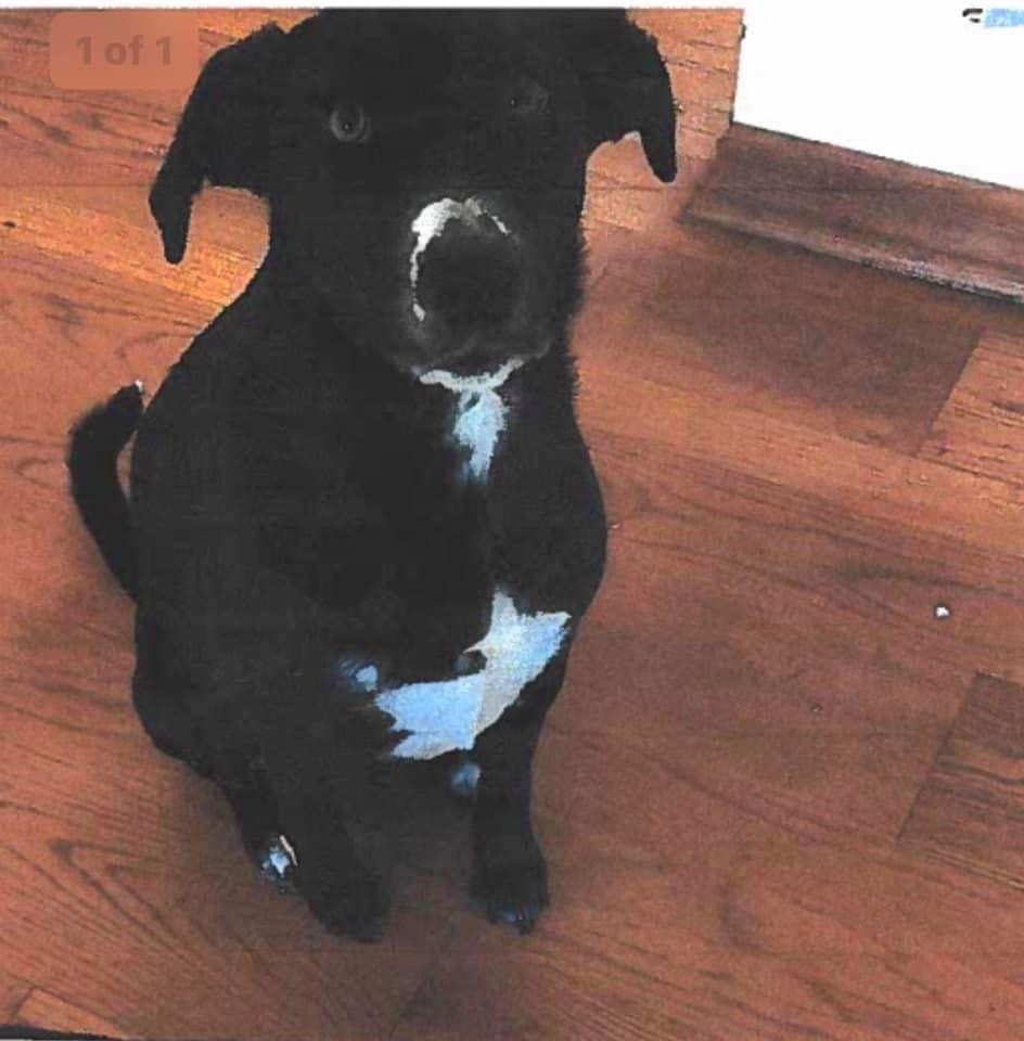 Pet Description:Lab mix. Black with white tip on nose, chest, tips of back feet and tip of tail. |