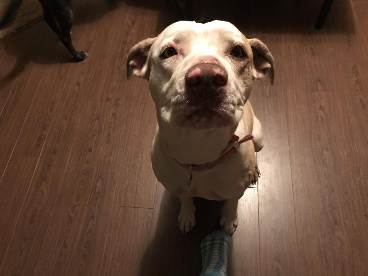 Pet Description:Big dog but sweet. White and tan over her ears and she is wearing a bright pink collar with silver reflecting stripes |