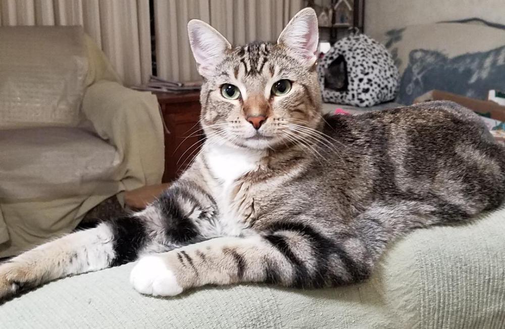 Pet Description:Finnie is a brown tabby and white with thick black spiral tabby markings. His chest, feet, and stomach are white and he has some tan markings as well. He was a feral kitten when rescued and is still skittish and probably reverting back to his feral survival skills. |