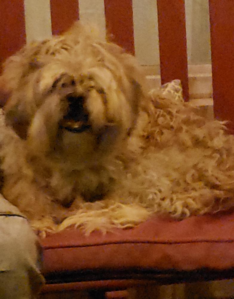 Pet Description:Very sweet little dog. I think it is a boy?? The dogs hair is really tangled up so it's very difficult to completely tell if it's a boy or a girl... it looks like it's a Shih tzu / Maltese mix. All white. Has a little blue collar with a clear plastic tag that had a little slip of paper inside... But the only thing I could make out on it was |