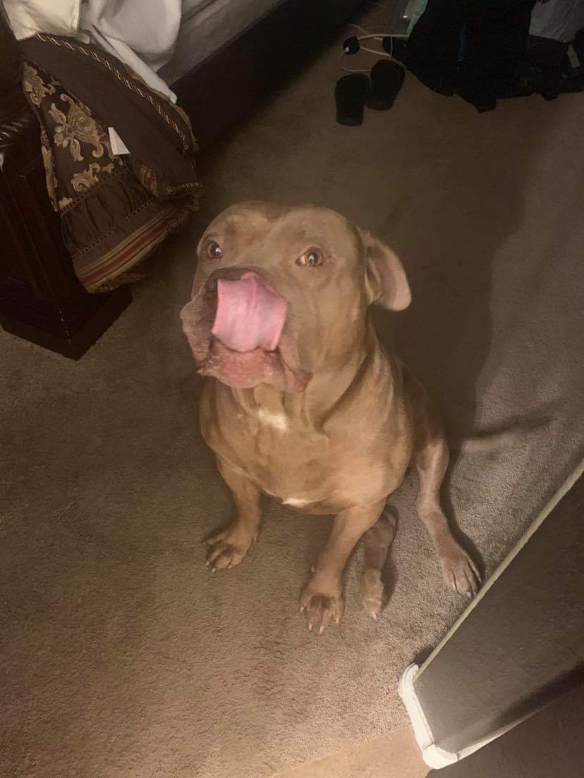 Pet Description:Light and dark brown Brindle, white on neck. About 95lbs. Very loveable dispute size |