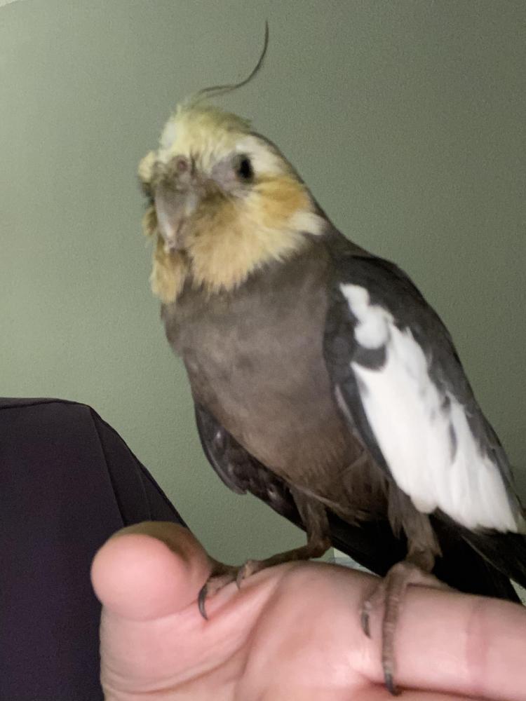 Pet Description:Female Cockatiel found on our back patio. Bird is mostly grey and white with a pale yellow head. Very friendly and well-behaved. |