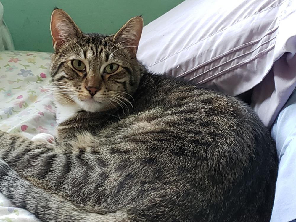 Pet Description:Sparky is a grey black white and brown male tabby He is 2 years old and a little chubby |