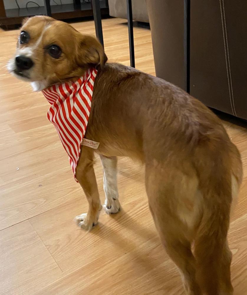 Pet Description:Small, mixed-breed dog. Light brown/tan coat. Still wearing his leash. He is shy but friendly. |