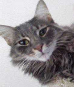 Pet Description:Grey with cream color on face, long hair, fluffy tail, small bald spot between shoulders, green eyes |