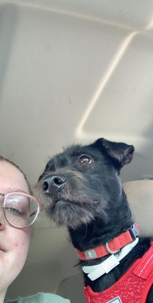 Pet Description:Small black dog. Last wearing a red collar. Scruffy face |
