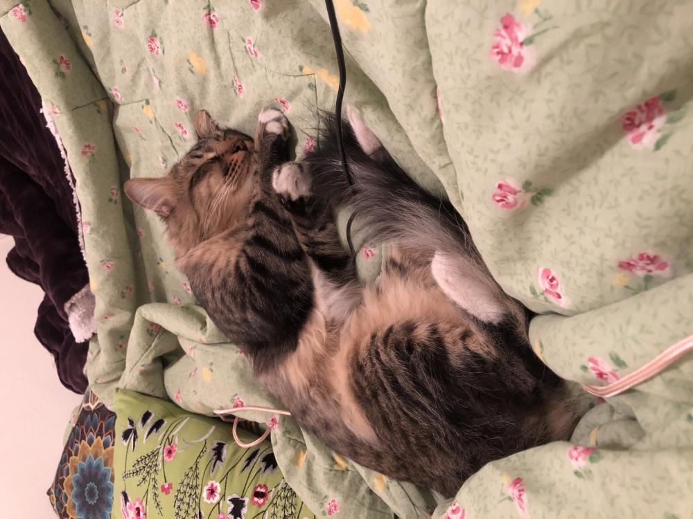 Pet Description:Small, fluffy tail, black stripes on his legs, white stomach, looks like a main coon |