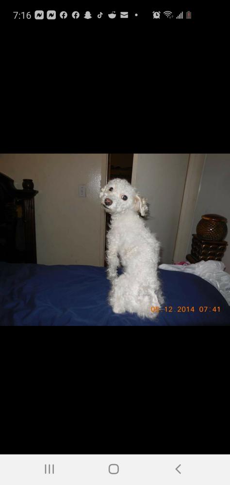 Pet Description:small white poodle 6 to 8 pounds was shaven and the tail looks like a rats tail and is missing top front teeth. |