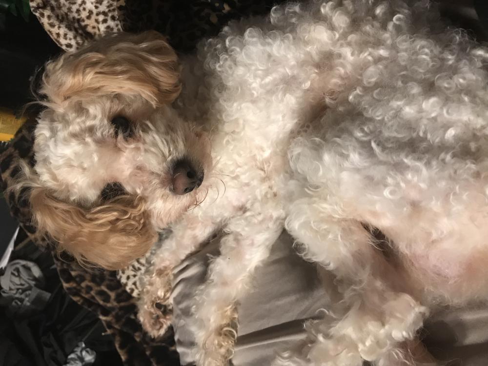 Pet Description:Small poodle. Got lost with his partner a sharpae tan dog Poodle is white color with brown ears. |