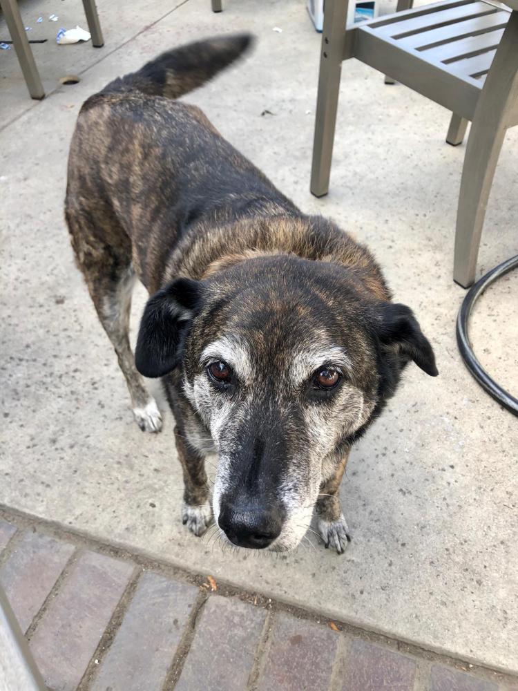 Pet Description:13 yo Shepard Mix, Brindle Color with grey on muzzle. Likes to lick. |