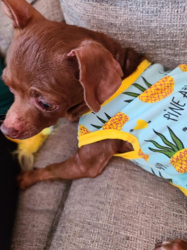 Pet Description:Small brown chihuahua wearing a maroon sweater and gold collar. |