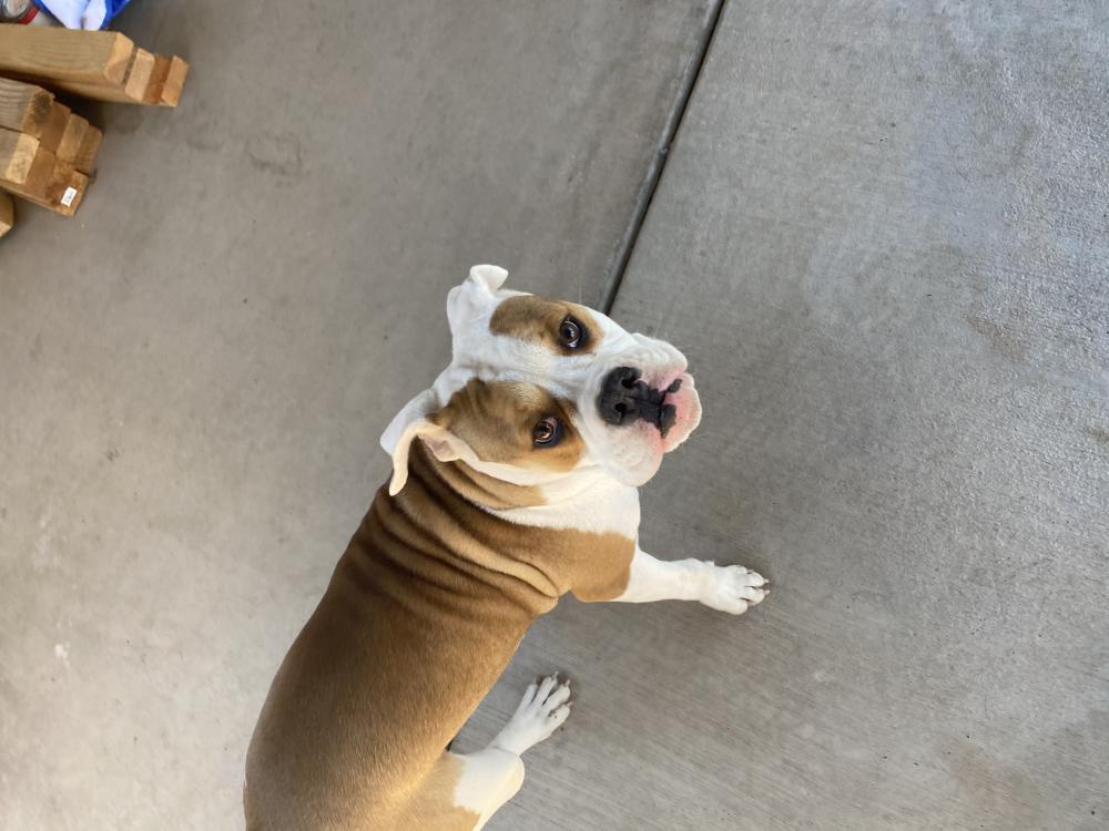 Pet Description:Female bully breed. Found walking down street. No collar or tags, and vet was unable to find chip. She is very friendly and hyper so I’m guessing she is younger. White with golden brown spots. |