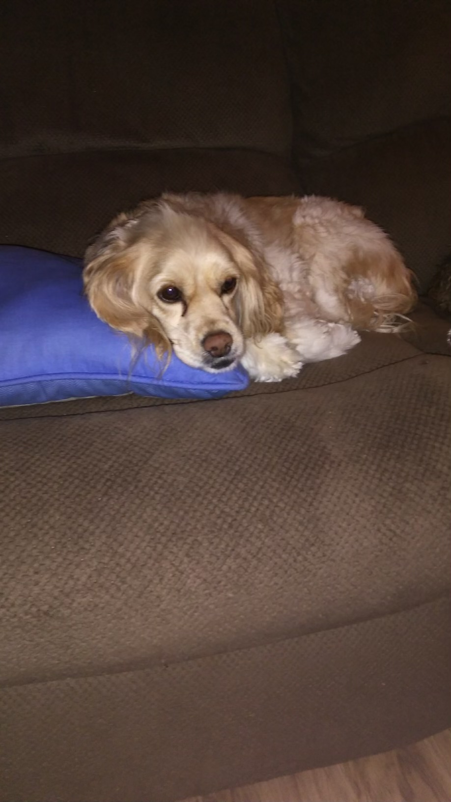 Pet Description:Cocker spaniel mixBlonde hairUnder biteTeal collar pink name tag |