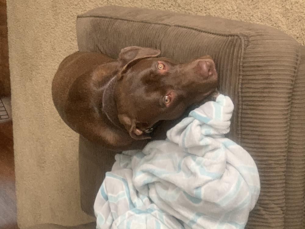Pet Description:Unaltered female chocolate lab with white spot on chest and yellowish eyes. Was wearing a Last Call Brewing Company collar and left the boarder scared. |