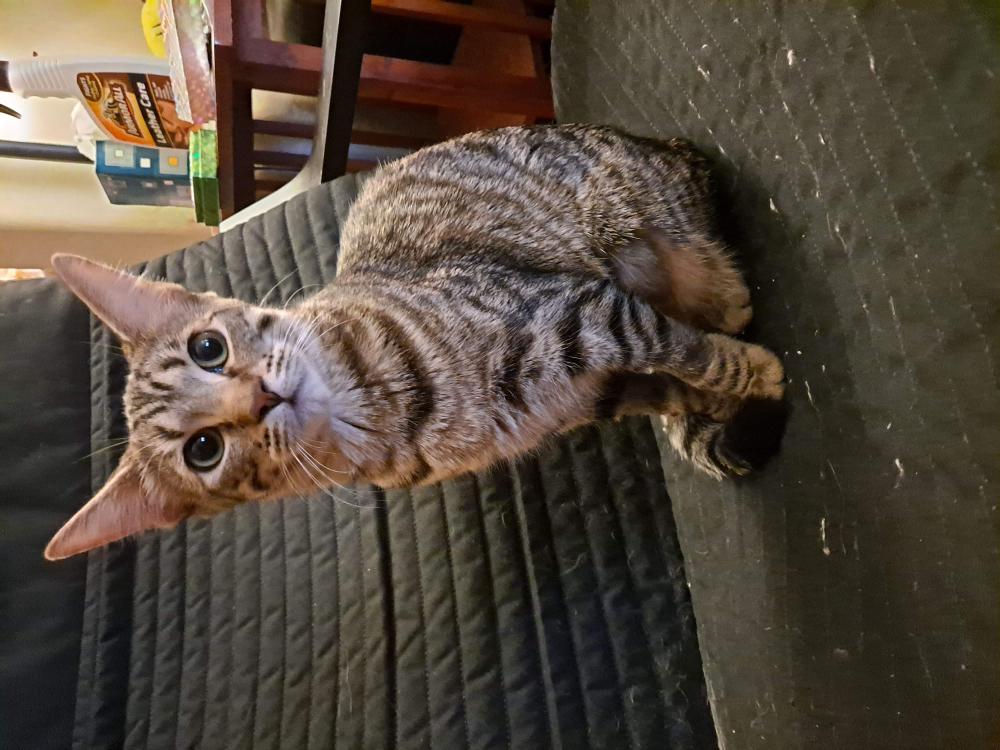 Pet Description:Kitten, 8 months old tabby. Short (about half) tail. Friendly. Chipped. |