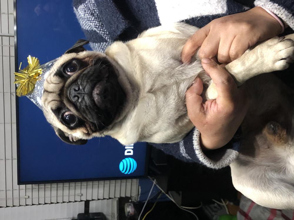 Pet Description:He is a male pug . Medium sized with black ears and responds to Butters |