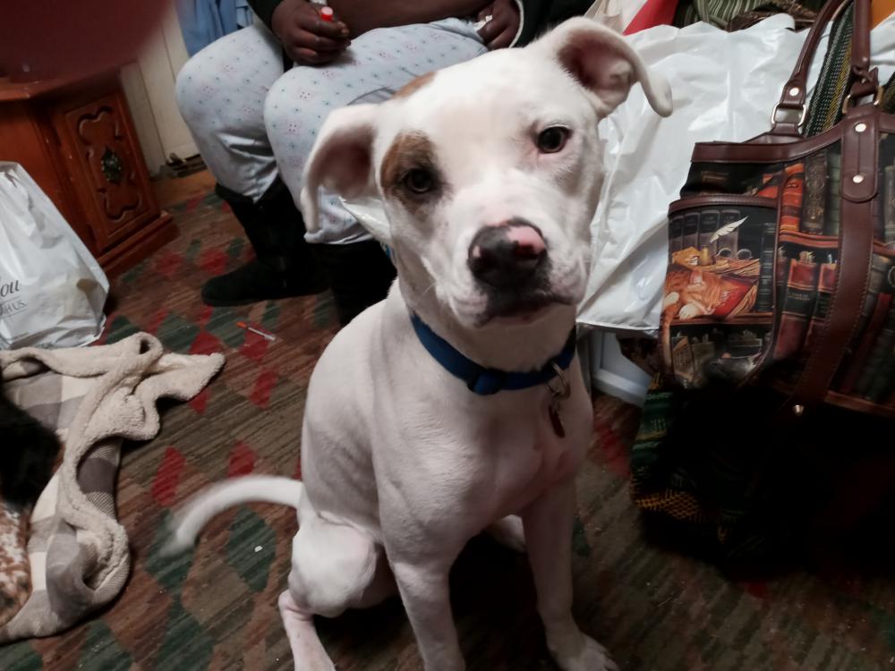 Pet Description:White with a brown circle around one eye. Thin and narrow with a slightly curved neck and long legs . even though she is a mid size dog. Her breed is - EGYPTIAN RIDGEBACK RUE |