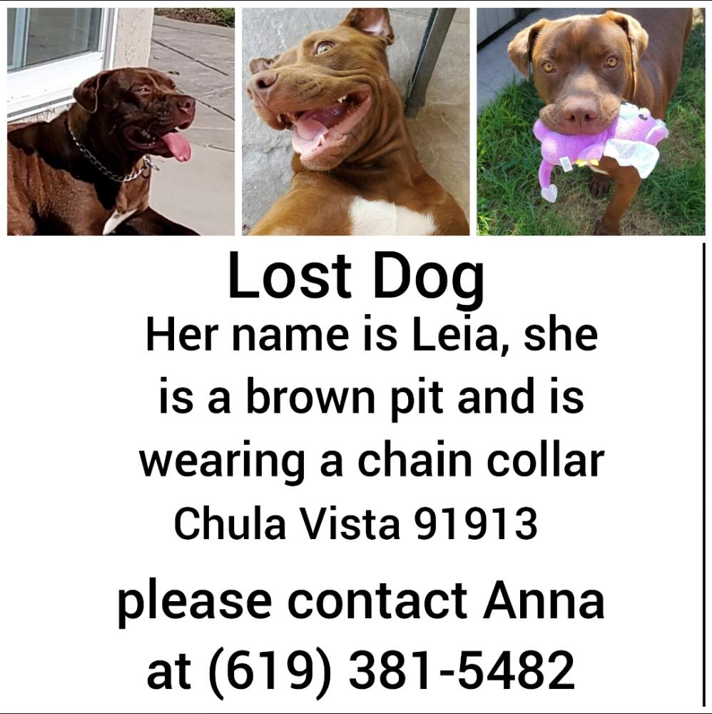 Pet Description:she is a brown pit bull with a chain collar, lost on chula vista 91913. |