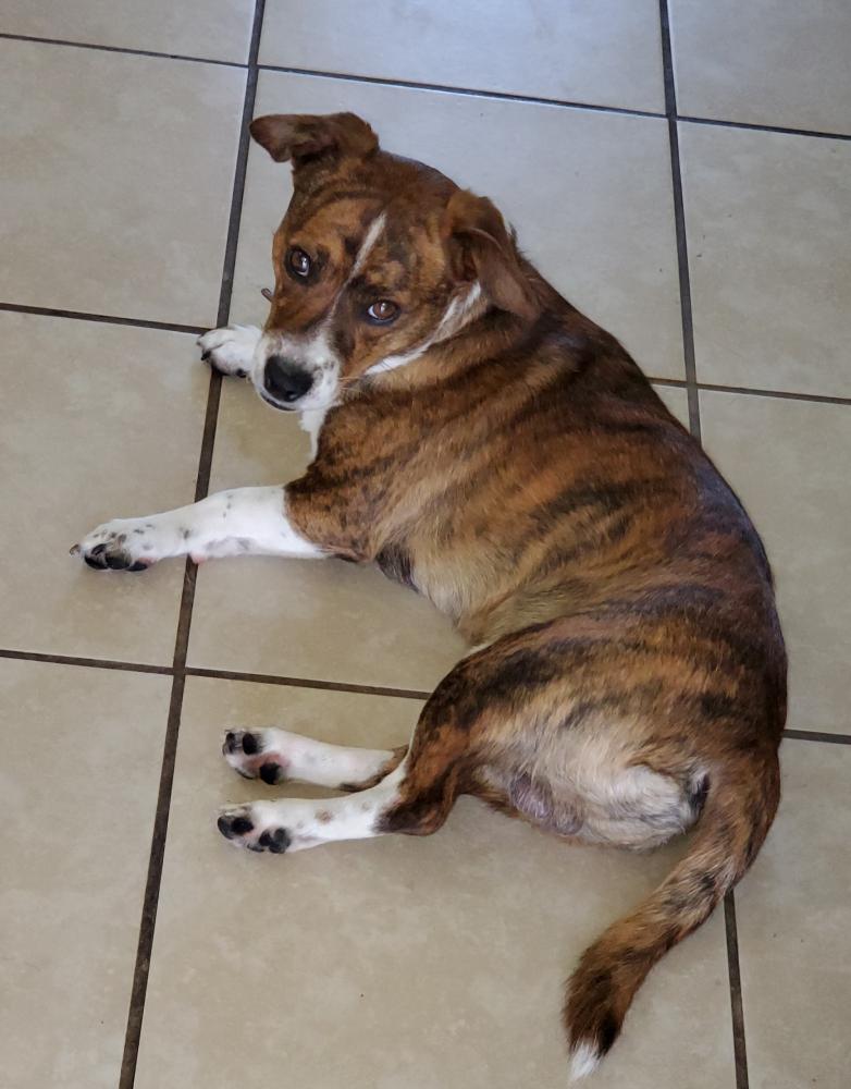 Pet Description:He is a small dog looks like a over grown wennie dog. He is mostly brindle with socks going up all 4 legs a white tip on tail and a white spot on the back of his neck n nose he also has a leather collar on but no tag cuz it broke off of him some time ago |