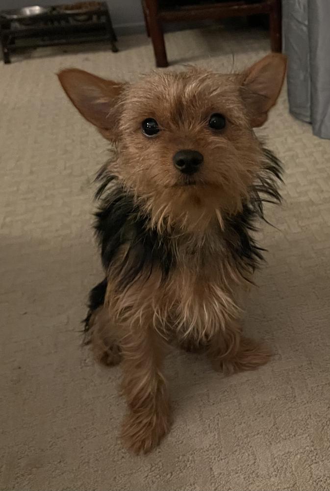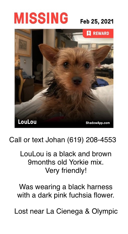 Pet Description:LouLou is a 9months old black and brown Yorkie / Chihuahua mix. Very friendly. Wears a pink / fuchsia flower on a black harness. |