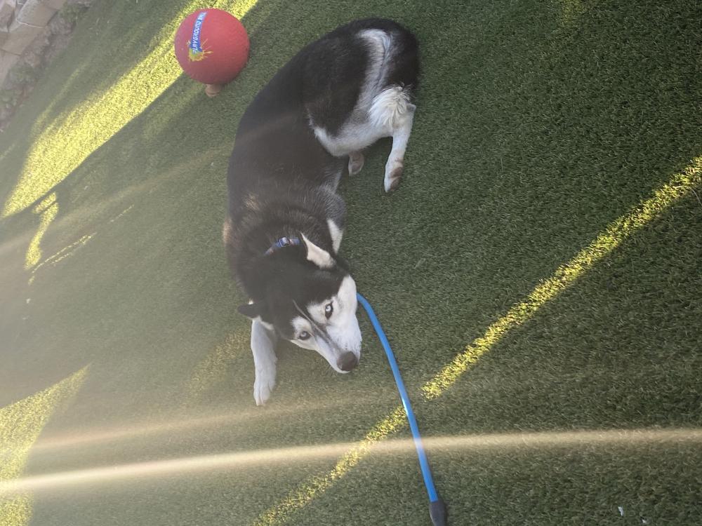Pet Description:He has a black collar very friendly his left eye is two colors half brown/ blu his name is blu |