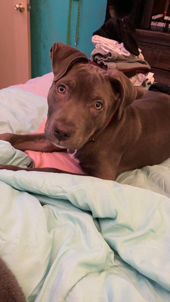 Pet Description:4 month old blue nose pit / mixed with lab. Grey blue color with white chest and small white patches on feet. Scar next to eye. Black collar and sliver chain. About 25/30 pounds. Whines to talk, bites his leash love children and people. |