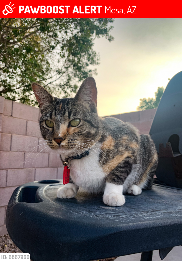 Pet Description:Percy is a small Tabby/Calico cat. She has a white belly and white paws. She should be wearing a blue sushi collar with a red tag and she IS microchipped. She also has green eyes. |