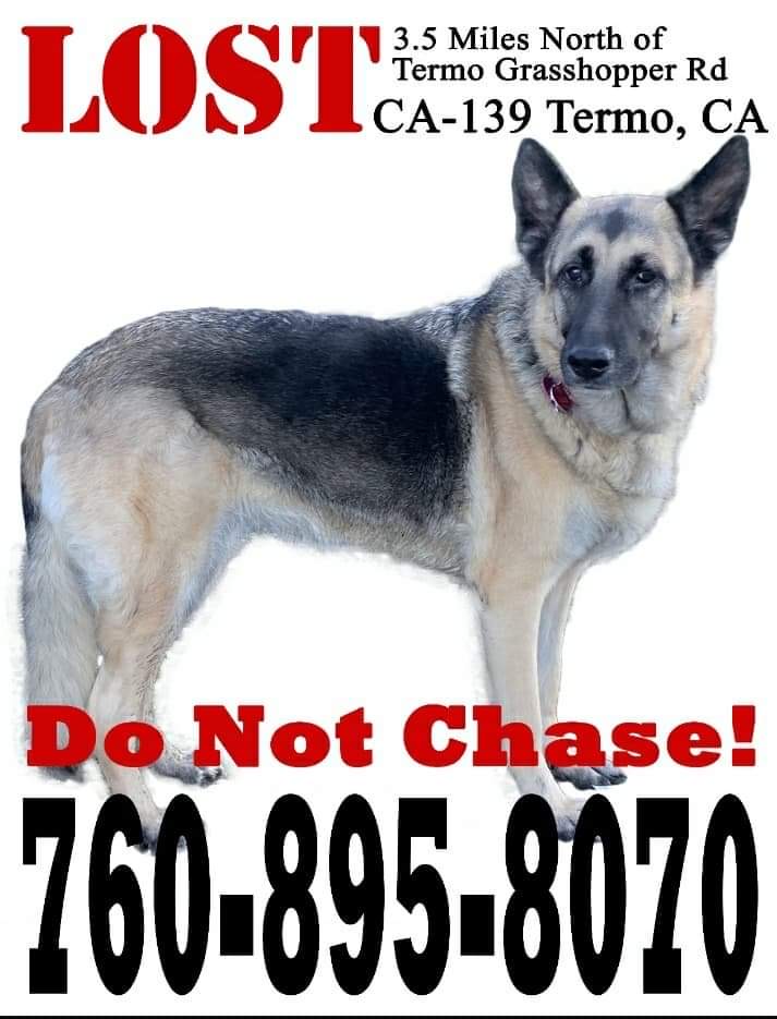 Pet Description:11 y.o. Spayed, microchipped, tagged, female EU German Shepherd from WA State. Escaped horrific car wreck on CA139 in Modoc Natl Forest. 25 mins south of Adin, CA and 1.5 hours north of Susanville, CA |