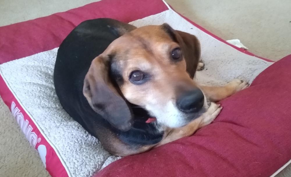 Pet Description:Black and brown male. Unaltered, older (maybe 10). Approx 60 lbs. Face looks like beagle mix. Very friendly and good with kids. Red collar with blue lizards but no tags. |