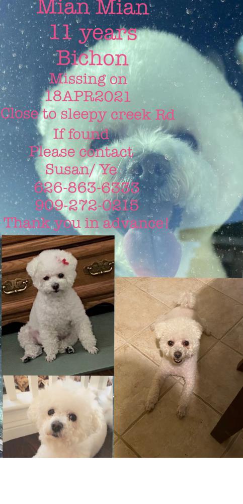 Pet Description:White bichon dog, 11 years female, with no collar |