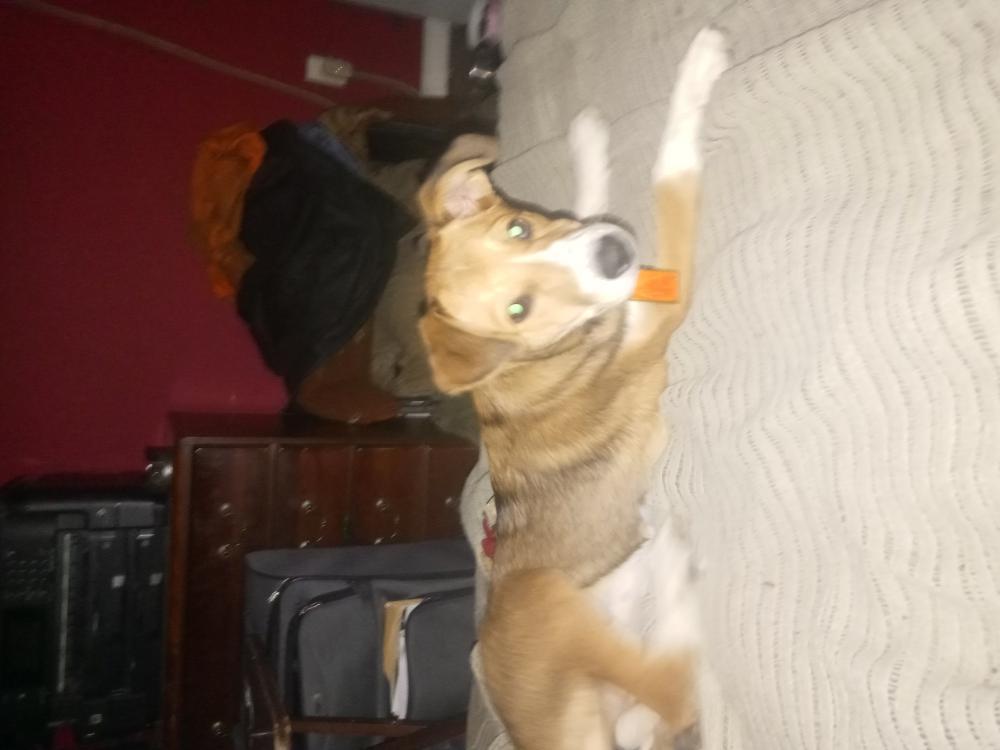 Pet Description:She's 8 months old large mainly light brown white chest white paws she looks like she's got freckles on the bridge of her nose |