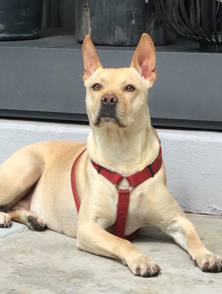 Pet Description:Medium/large sized pitmix, pointy ears, very sweet. No harness or collar. |