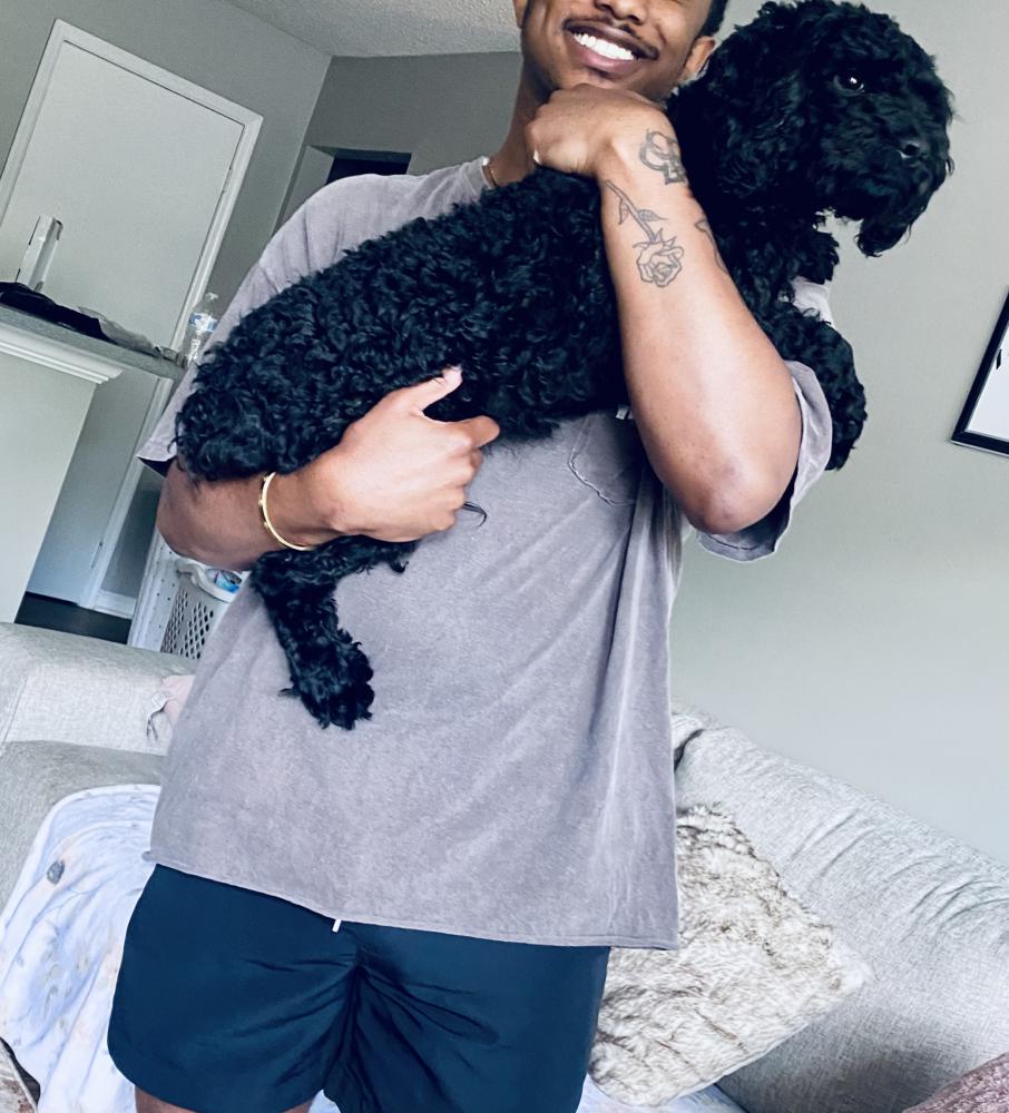Pet Description:Small jet black cockapoo. Answers to Legend. black and red collar |