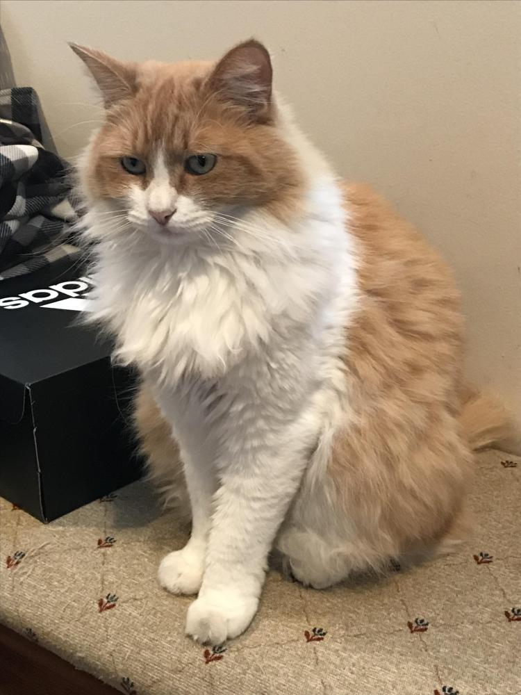 Pet Description:Orange and white cat, primarily white on chest and legs, orange on back and face. Medium sized cat, very fluffy. Very light green eyes. |