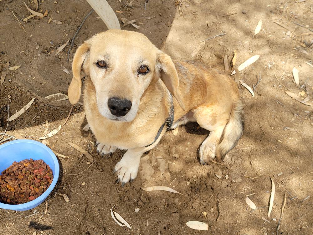 Pet Description:Dauschund & yellow lab mix with dog harness on. Unchipped male. |