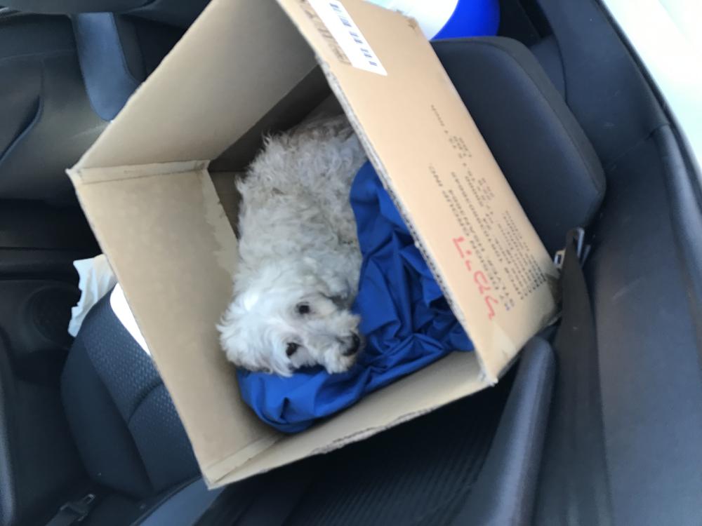 Pet Description:Small white dog, less than 20 pounds. Light brown patch of fur towards back end. Missing few front teeth, one very crooked bottom tooth. Not aggressive. |