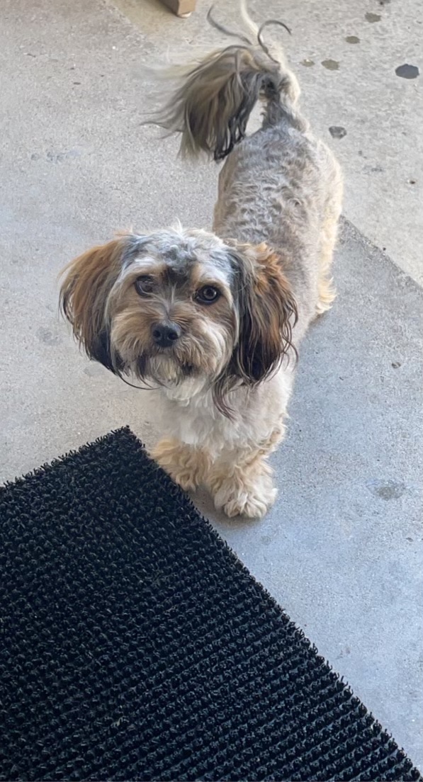 Pet Description:Medium size Looks like a maltipoo Dark brown with black hair as wellVery hyper active Likes to bite toes when excited Has trimmed hair all over body except ears,tail, face, and paws |