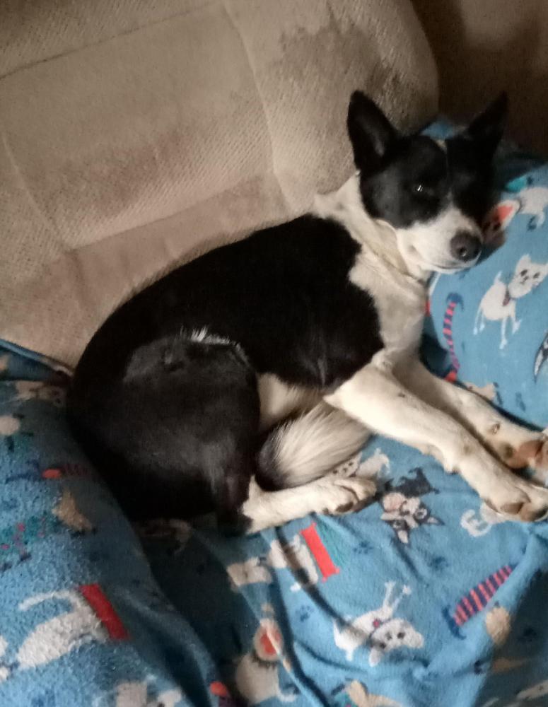 Pet Description:she has a blue collar she has a white strip down her face and short hair |