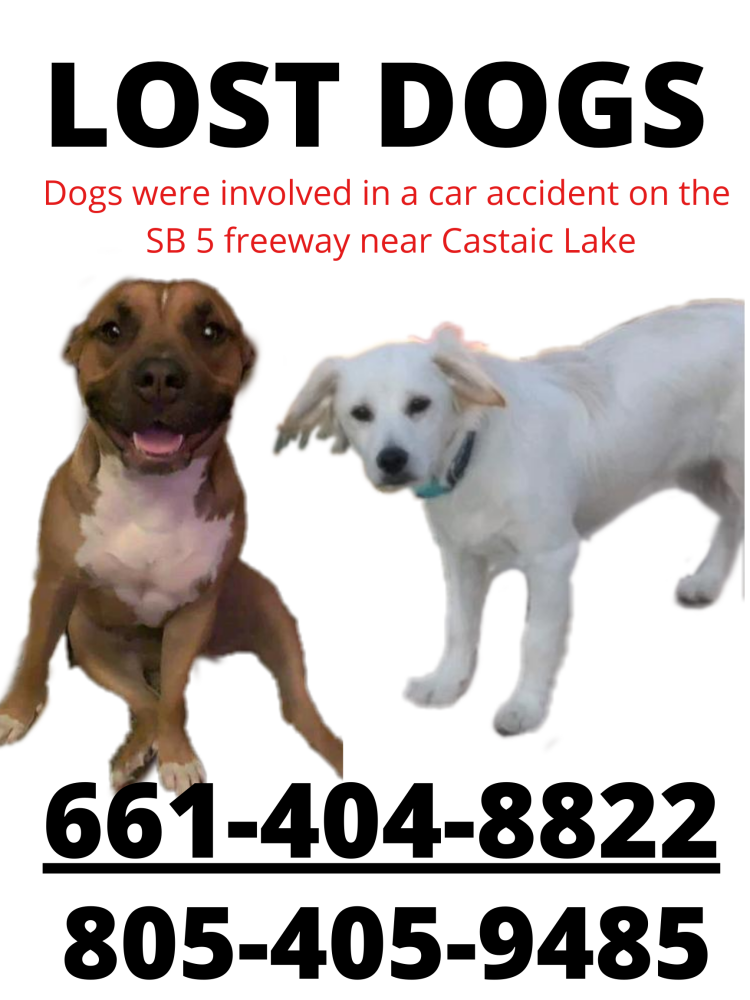 Pet Description:Sharing 7/21From Castaic, CA SB 5 freeway near Castaic LakeOwners are working with Dog Days Search and Rescue so no need to comment with all the advice. Unfortunately dogs ran up the freeway and we are needing to get the word out in case they were picked up.Both slipped their collars. Neither microchipped. |