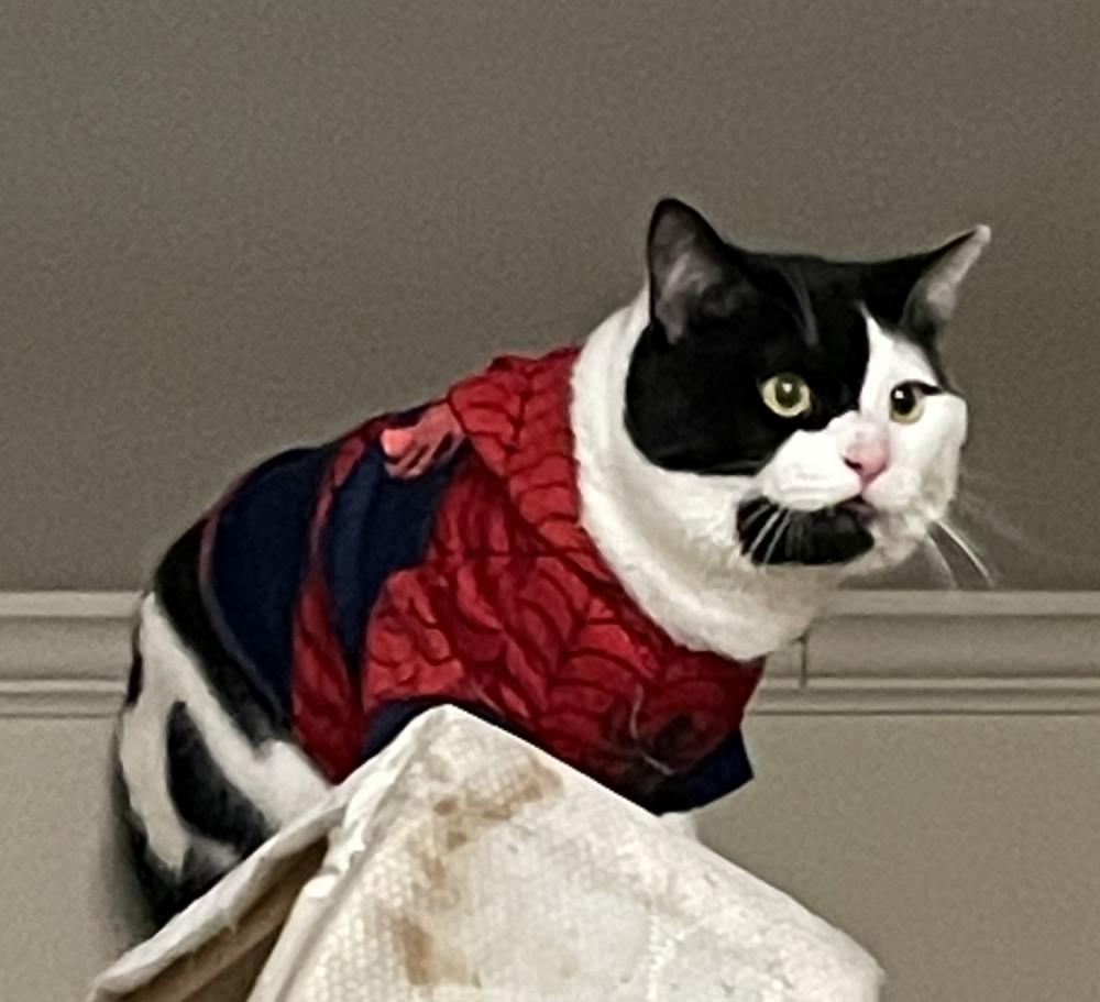 Pet Description:Black and white, chunky, young and wearing a Spider-Man shirt. It’s possible he’s not wearing the shirt anymore. His eyes are yellow. |